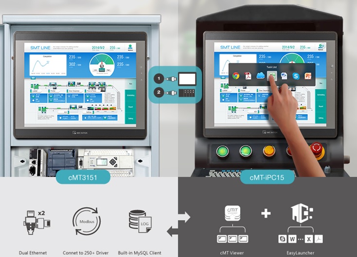 Let’s adopt the same concept to the industrial control field. Conventional HMI can only be used for parameter input, machine control, data logging, alarm notification, and plays only a complementary role to the PLC. In contrast, the HMI in the generation of industry 4.0 must be able to run third-party applications on the same platform. Example scenario include: Viewing, exporting, and printing the data / event log of the device in Excel, consulting the user manual in PDF Reader, modifying PLC program in PLC programming software, contacting a personnel in a faraway office through messaging app such as Skype. Just as how cell phones have evolved into smartphones, the conventional HMI should evolve into smart HMI. That is, HMI not only functions as monitoring and control device on the plant floor, but also serves as a communication bridge linking on-site machine and a host computer (eg: ERP, CMS, SCADA). Weintek has released a brand new model cMT-iPC15, which functions as HMI, and also runs third party applications. cMT-iPC15, based on Windows OS, can connect cMT-SVR using cMT Viewer and serves as HMI, and it runs third party applications. By using EasyLauncher dedicatedly designed by Weintek R & D group, it’s easy to customize cMT-iPC15’s desktop into smartphone-like UI and manage access control of apps.