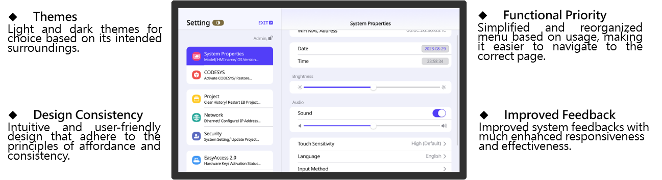 Furthermore, the cMT3072XP will be the first to introduce the brand-new system settings user interface. This new interface, redesigned with affording and consistent elements, revamped menu and improved feedbacks, is bound to elevate the user experience significantly. Additionally, the new interface offers two themes, light and dark, providing users with the flexibility to choose one that best suits the surroundings.