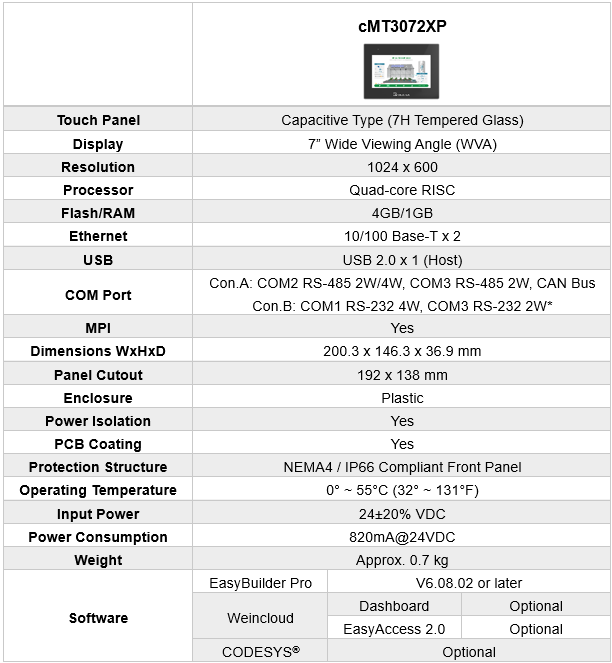 Categorized as an Advanced cMT X HMI, the cMT3072XP offers a multitude of software support, especially in capabilities related to data integration and smart monitoring. In terms of data integration, it comes with a built-in OPC UA server, MQTT communication protocol, and SQL database server connectivity to facilitate transmission of on-site data. For smart monitoring, it provides tools such as VNC monitoring, WebView web monitoring, cMT Viewer app monitoring, and Weincloud remote monitoring. With a solid support in software, the cMT3072XP can be a powerful data integration solution, serving on-site and remote operations alike.