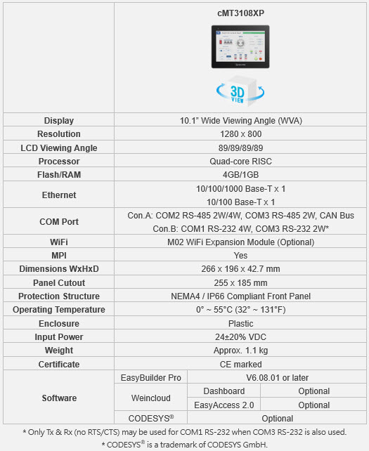 Being a part of the cMT X product line, cMT3108XP is equipped with powerful hardware capabilities such as the quad-core CPU, 4GB Flash memory and 1GB of RAM. As for connectivity, it hosts a full suite of options, including dual Ethernet ports, all the serial port options (RS232 2W/4W, RS485 2W/4W, SIEMENS MPI, CAN Bus), and WiFi expansion with M02. In terms of software support, as an Advanced cMT X HMI, cMT3108XP is full-featured, offering a multitude of enhanced features to facilitate smart system integration.