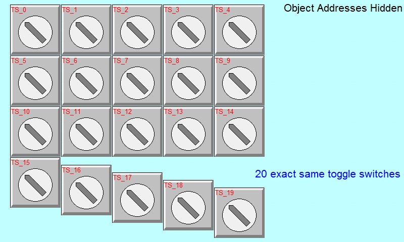 In the following screenshot, 20 toggle switches look alike with their addresses hidden. It can be difficult to find a specific object to modify parameters.
