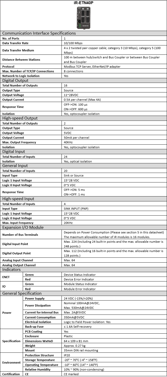 iR-ETN40P provides built-in support for MODBUS TCP/IP Server and EtherNet/IP Adapter protocols and comes with 24 digital inputs and 16+2 digital outputs. Apart from the built-in I/O, the expandable design makes it possible to add additional digital, analog I/O, temperature modules, or pulse modules as required. Additionally, input and output connectors are of push-in type, which greatly simplify installation and wiring tasks.