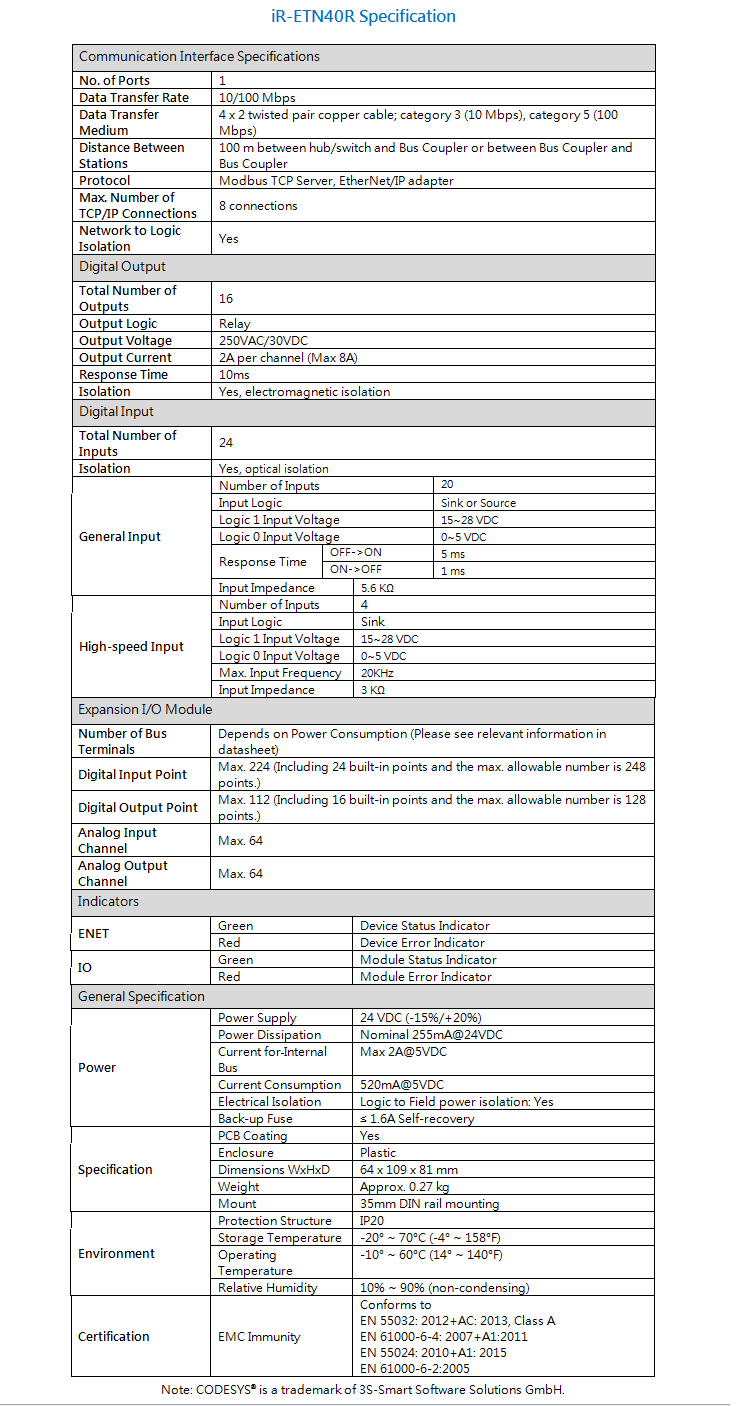 Supporting Modbus TCP/IP and EtherNet/IP industrial Ethernet protocols, iR-ETN40R is an expandable Ethernet remote I/O module with 24 digital input channels (including 4 high-speed ones) and 16 relay output channels. It provides various unique features to support a highly efficient and cost-effective implementation of modern automated control systems.