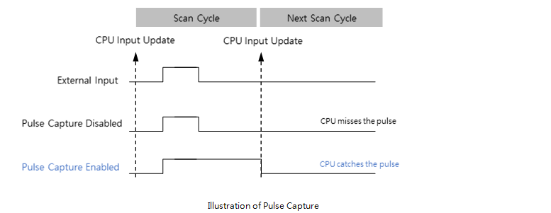 Pulse capture feature ensures that a high-speed pulse signal shorter than one scan cycle is held until the next scan cycle so that no pulse is missed.