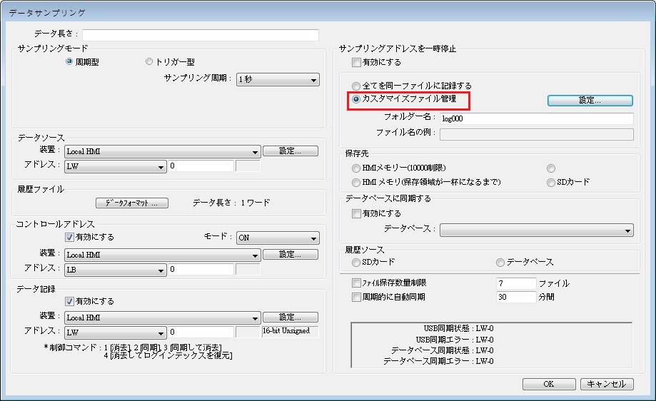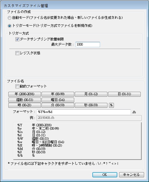 そこで、[カスタムファイル処理]機能を利用すれば、ユーザーに履歴ファイルの名前をカスタマイズさせ、また特定したアドレス或いはデータが変更されたたびに1個の履歴ファイルを生成させるか、もしくはデータ数が一定した数量に達した後、1個の履歴ファイルを生成させることができます。