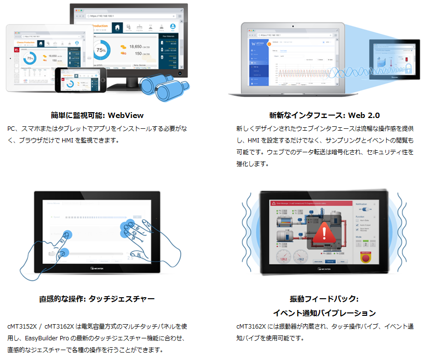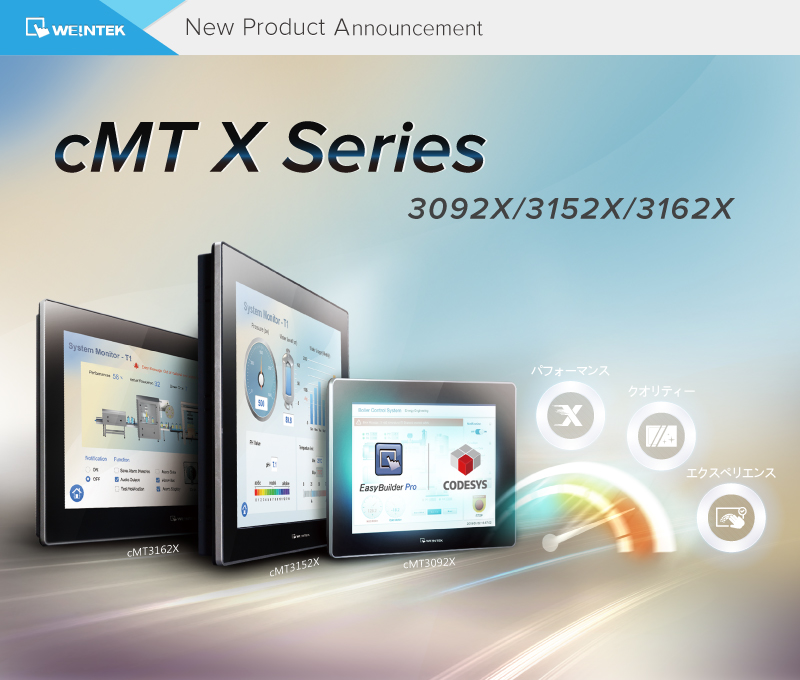 今時のHMIは、工場内で全方位のタスクを担い、様々な機能:データ表示、装置制御、データ保存、PLC通信、プロトコル変換、画像表示、アラーム通知、映像・音声の再生、IIoTへの接続・統合…などがあり、これらの機能は現在、市場でハイスペックHMIへの基本要件となりました。このようなマルチタスクは、HMIの演算処理にかなり大きな負荷をかけてしまいます。一方、現代人は既にスマホやタブレットなどの端末を使い慣れているので、HMIの操作感及び速度に対しては従来と比べてより求め・重視しています。これにより、Weintekはこのたび、もっとパワフルなcMT XシリーズHMI: cMT3092X / cMT3152X / cMT3162Xをリリースしました。cMT Xシリーズは、現行HMIの中で最もハイスペックのプロセッサを搭載し、最強の演算処理能力で高速で流暢な操作感を提供し、ユーザーが操作速度への要望をお応えします。