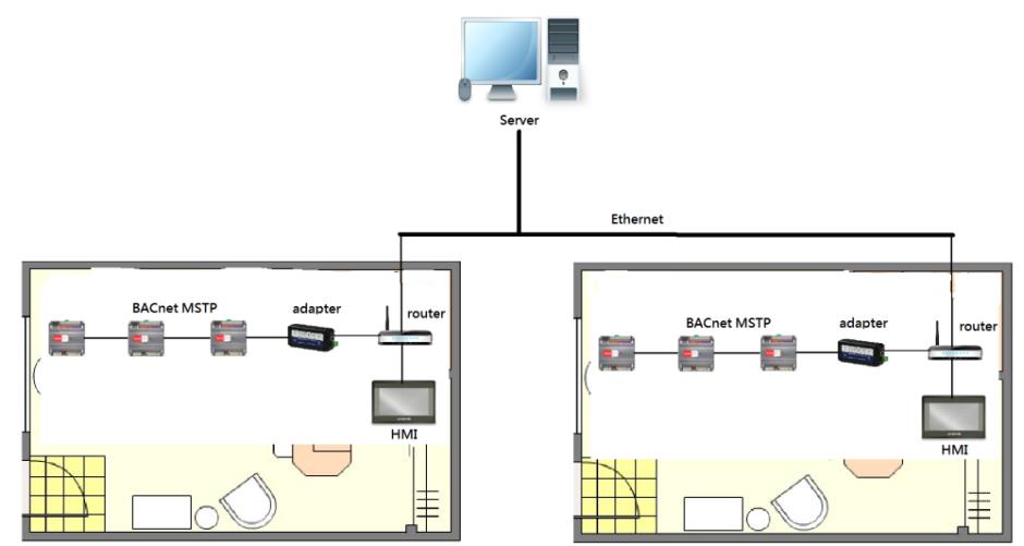 BACnet MSTPドライバがあれば、各オフィスにBACnetアダプタとルーターを設置する必要がなくなります。直接にHMIをBACnet MSTPシステムにつなぐことができます。