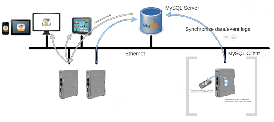 - Weintek HMI cMTシリーズと合わせて使用すると、MySQLデータベースでBACnet MSTP装置のデータを集中して管理することができ、別途BACnetサーバーを構築する必要がない