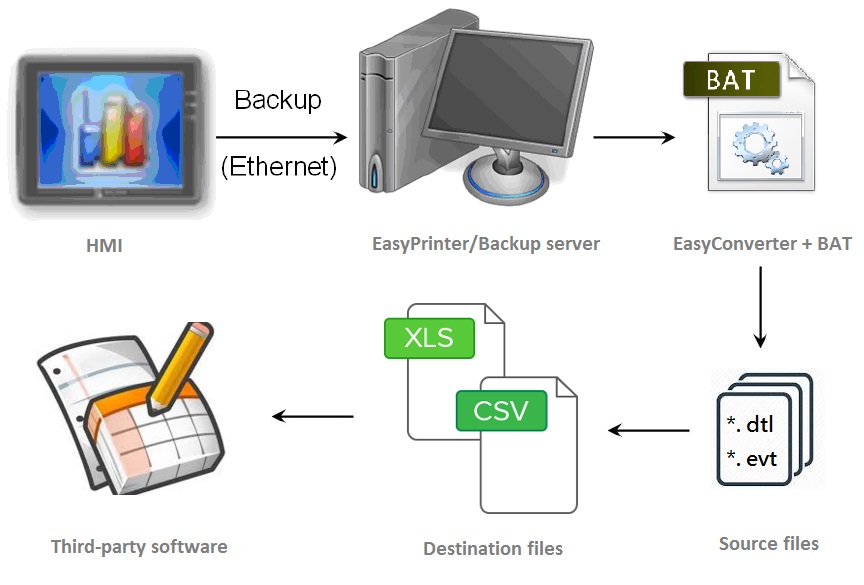 あるエンジニアがHMIから大量の履歴データをPCにアップロードし、データをCSVフォーマットに変換してからサードパーティ製ソフトウェアにロードしたがる場合。