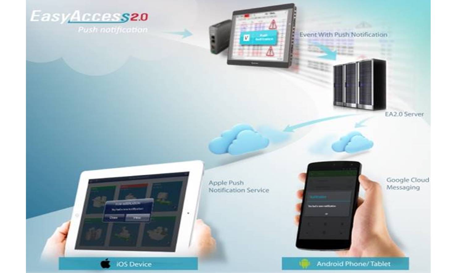 パワフルなリモートアクセスサービス:EasyAccess 2.0機能を通じれば、ファイアウォールを調整する必要がなく、直接に遠隔地の事務室からデバッグや装置データの更新を行うことができます。プッシュ通知機能を合わせて使用すると、装置に異常が出た場合、モバイルデバイス(iOS/Android)で関連情報をユーザーに提示することができます。
