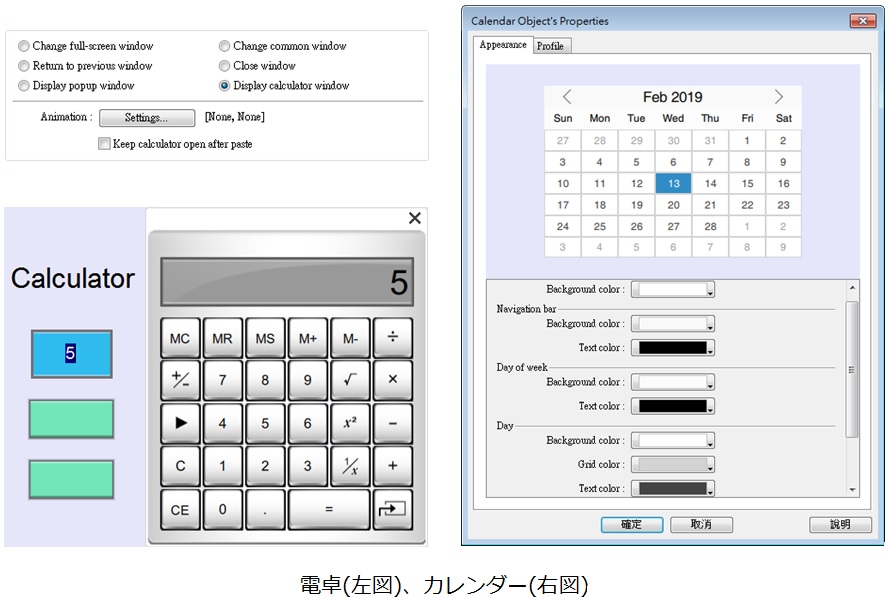 [オブジェクト]タブà[時間関連]à[カレンダー]を押せば、下図右のような[カレンダー]オブジェクト属性ダイアログボックスが開かれます。本オブジェクトは単一の固定フォーマットしかありませんが、色を変更可能です。