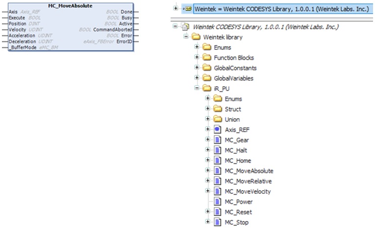 PLCopen Motion ControlとCiA402規格に基づいてデザインされたモーションコントロール関数ブロックを使用すれば、モーションコントロールのコマンドを下すことが容易で、他のモジュールと統合してもっと複雑な応用に使用されることもできます。