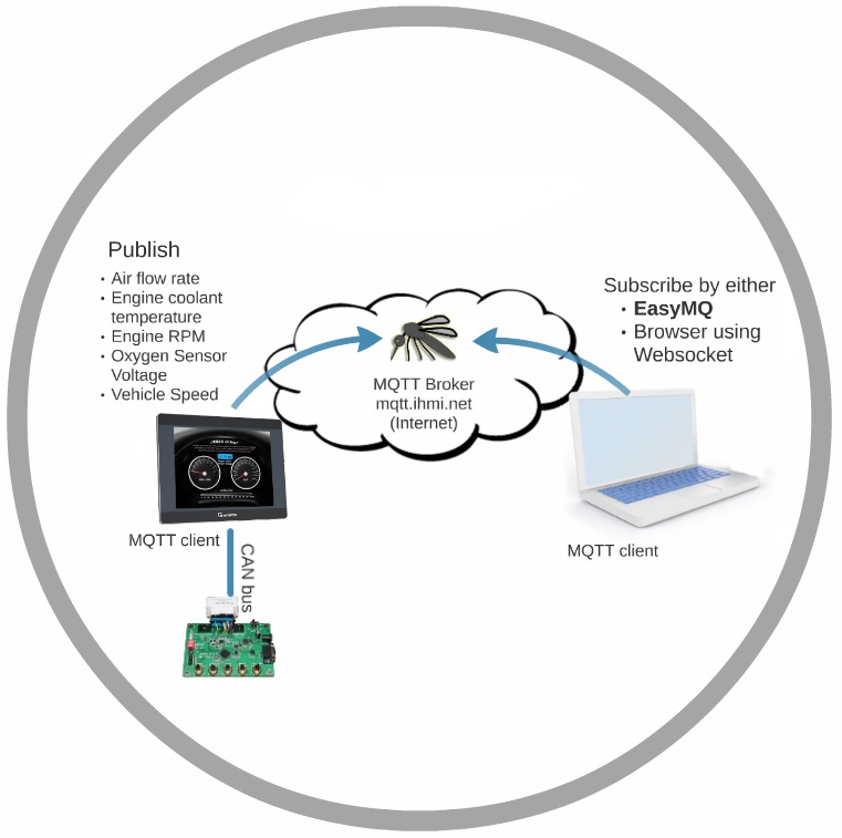 HMIがPLCに通信し、そしてデータ処理を行った後、MQTTでメッセージをネットワークのMQTTブローカー(プロキシサーバーの役目に当たる)に配布し、そしてブローカーからメッセージを購読者に送信することができます。HMIがファイアーウォールに在る場合、この方式を使用すれば、HMIからメッセージを送信することが可能です。