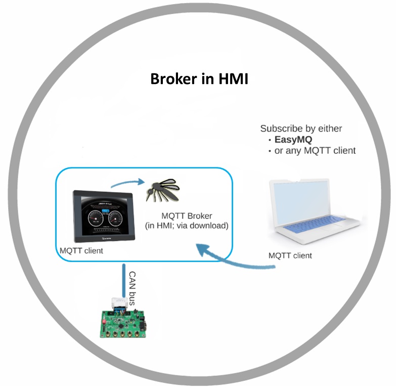 MQTTメッセージもHMIが内蔵したブローカーへ配布できます。即ち、購読者は別途でブローカーを探す必要がありません。MQTTのクライアントさえあれば、直接にHMIが内蔵したブローカーへメッセージを購読・取得できます。VPN、或いはEasyAccess 2.0等に合わせ、MQTTのクライアントにHMIを接続させたら、購読者はリモートでメッセージを入手できます。