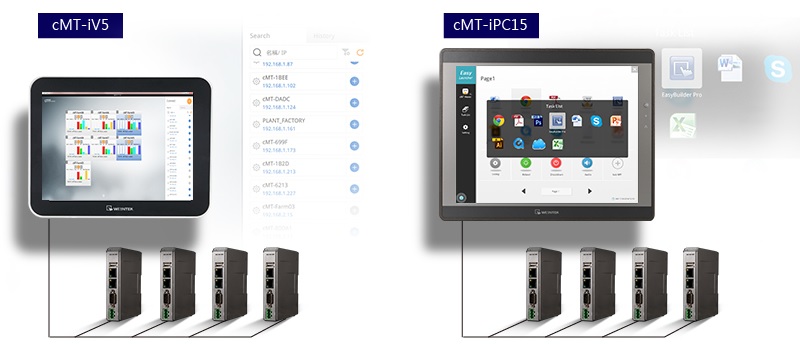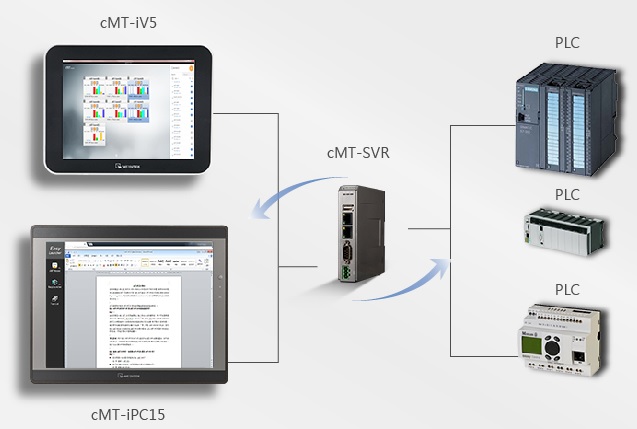 WeintekのcMTシリーズは伝統的な1装置対1スクリーンというHMI仕組みの制限を打破し、ユーザーは応用環境の需要に応じ、フレキシブルに1装置対マルチスクリーンを組み合わせることができます。ここの「装置」はcMT-SVRのことを指します。cMT-SVR はCOMポート及びダブルイーサネット通信ポートを搭載し、コントローラと接続し、マクロ、レシピデータ、データサンプリング、イベント/データログを取るなどのタスクを担当します。
