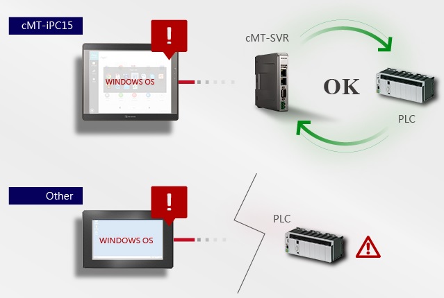 他のHMIメーカーがPanel PCでHMIソフトとサードパーティ製アプリを実行するので、Panel PCのCOM portで直接にコントローラと接続します。こういう仕組みの欠点は、Window OSが常にクラッシュし、それで装置の稼動が停止されてしまいます。これもWeintekのスマートHMI:cMTシリーズがPanel PC ( cMT-iPC15/cMT-iPC10 )をcMT-SVRに合わせて使用する理由です。cMT-SVRはコントローラと接続し、マクロ、レシピデータ、データサンプリング、イベント/データログを取る等、各種の異なるタスクを実行し、cMT-iPC15/cMT-iPC10はcMT-Viewerと他のアプリだけを実行します。cMT-iPC15/cMT-iPC10のWindow OSがクラッシュしても、cMT-SVRの稼動に影響しません。cMT-SVRに他の表示装置、例えば:cMT-iV5或いはiPad/Android tabletを接続してあったら、装置の稼動がWindows OSのクラッシュで影響されないことをより確保できます。