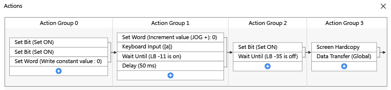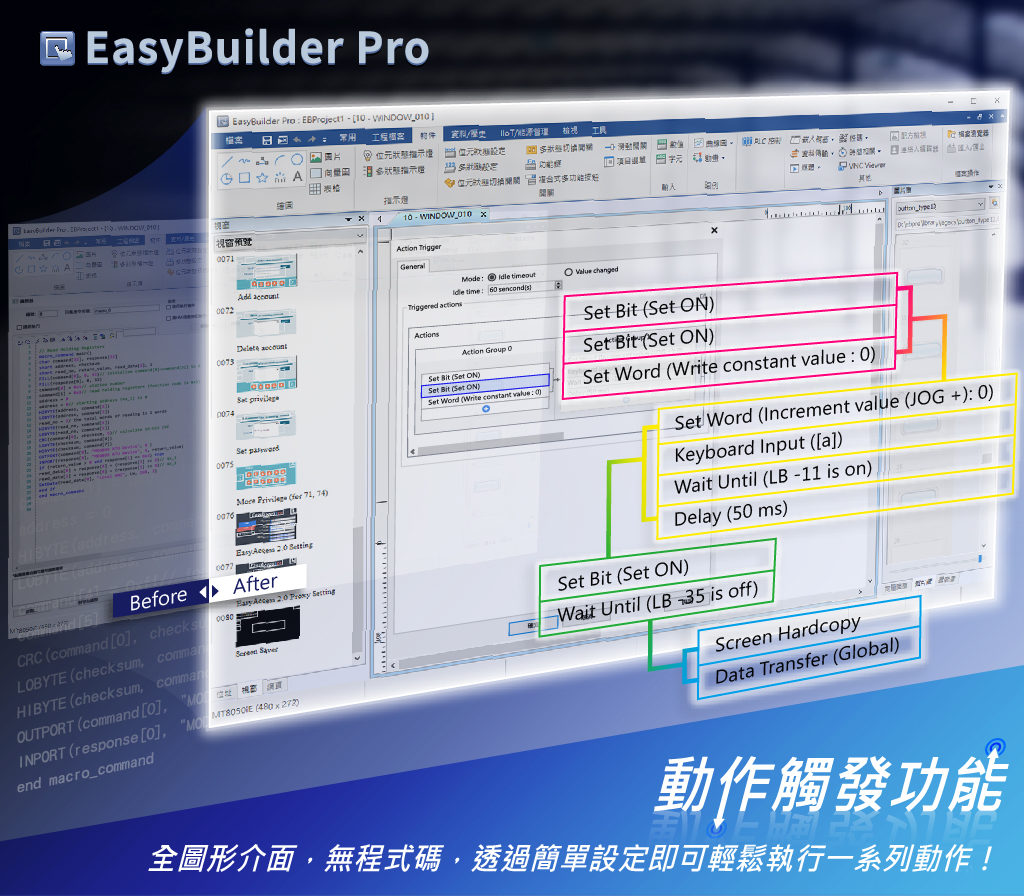 | 動作 | 可以自行組合各種動作,像是設定位元、設定字元、執行巨集指令、換頁、截圖、等待、資料傳輸…等。 |