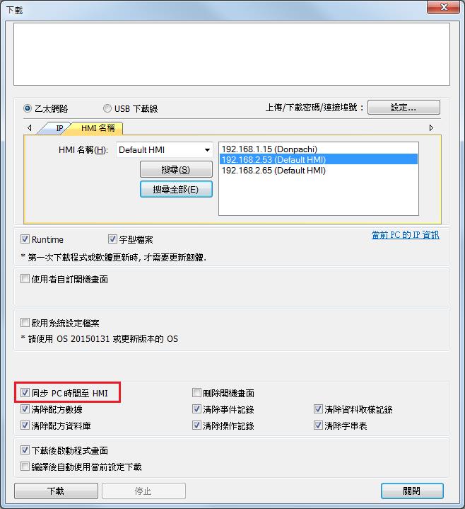EasyBuilder Pro的下載視窗新增 [同步PC時間至HMI] 選項,當在下載工程檔案的同時,亦可將PC的時間同步至HMI系統時間。