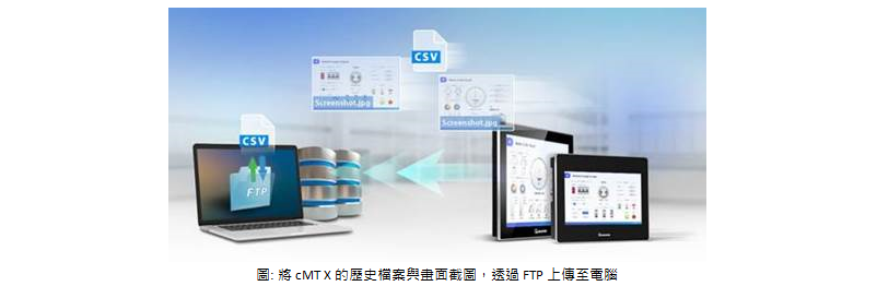 cMT X系列支援FTP功能,可以將歷史檔案或人機畫面的截圖,直接上傳到電腦。使用者無需額外安裝EasyPrinter。