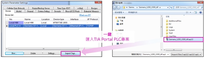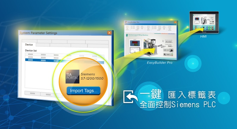 威綸科技工程軟體:EasyBuilder Pro是整合Siemens S7-1200/1500標籤表最完整的開發平台,不但支援S7-1200/1500的使用者定義資料型態(UDT)、預設的資料結構(Default Data Structure)、PLC Tag:[I]Input、[M]Bit Memory、[Q]Output等,現在客戶僅須”一鍵”將TIA Portal的PLC專案匯入至EasyBuilder Pro工程檔案後,即可使用原PLC專案上所有的PLC Tags與Program Block,大幅提升客戶端專案開發效率。