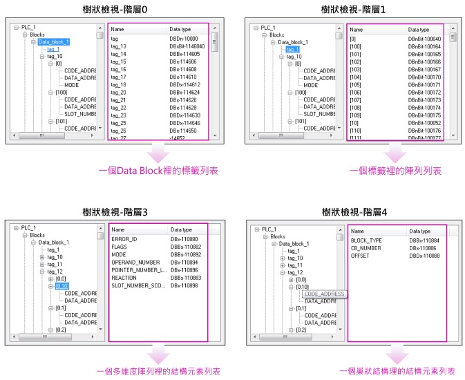 由於EasyBuilder Pro能完整支援TIA Portal的PLC多維度陣列與巢狀結構,因此用戶能以樹狀方式檢視所有標籤的多維度陣列與巢狀結構。相較上一代的EasyBuilder Pro版本,僅能對應單維度陣列與單層的結構,此版本的EasyBuilder Pro功能更加完善,能完全對應複雜的PLC位址架構。