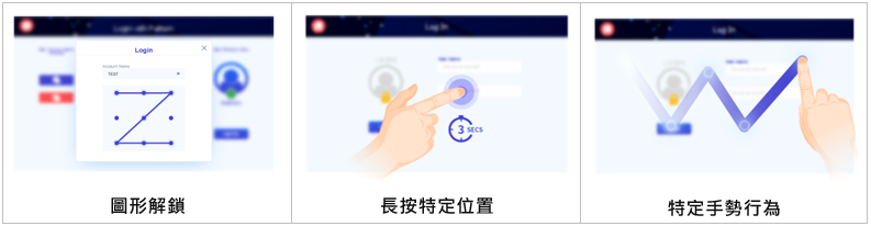 除了上述的新驗證登入方式,還有其他新穎的登入方式能透過 JavaScript實現,如手機上常見的圖形解鎖,或是操作行為辨識,像是透過長按特定位置或特定手勢行為以登入人機系統。這些登入方式跳脫傳統,為用戶帶來了更新穎的操作體驗。