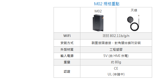 搭配同期發表的 M02,為 HMI 增添 WiFi 連線能力,以應用在佈線困難之場域