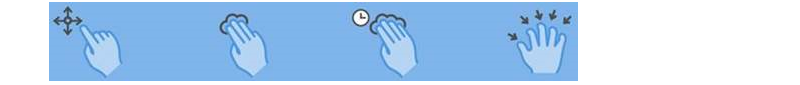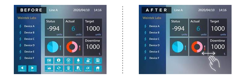 傳統人機介面UI的開發必須花許多時間在按鈕的外觀設計與位置的排列等工作,如下圖左。而下圖右則利用觸控手勢取代傳統按鈕的功能,除了節省設計按鈕所需的時間,畫面也更為簡潔,操作也更為直覺方便。