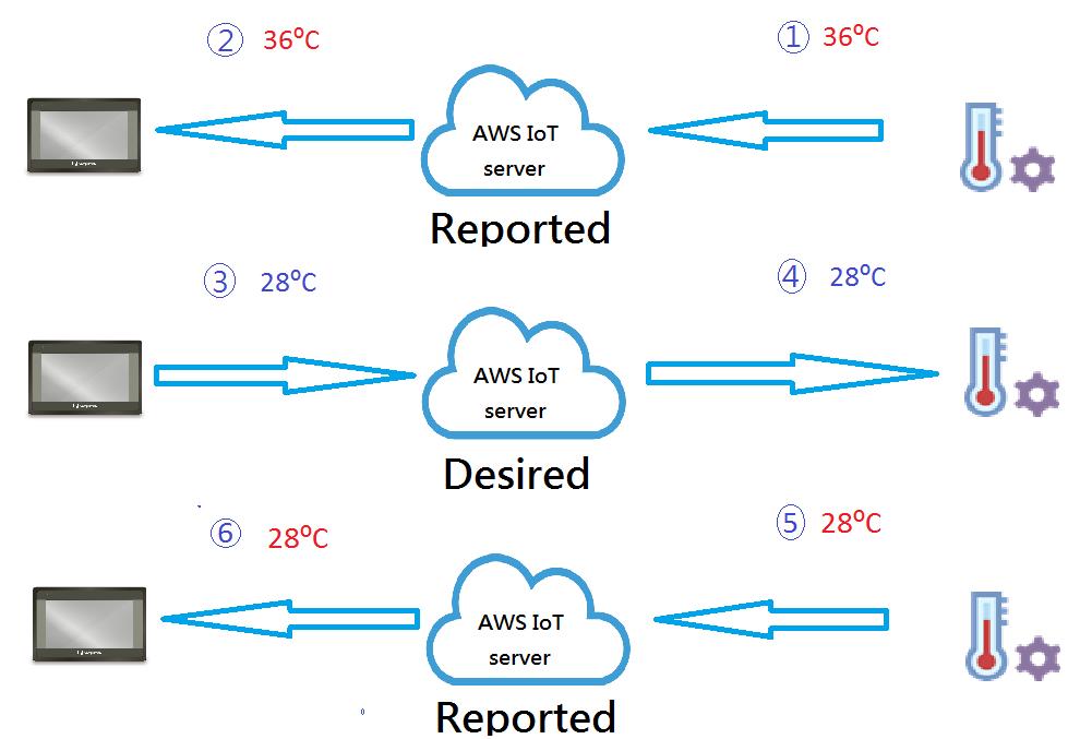 下面的例子以溫控器說明Reported與Desired。首先溫控器發送Reported命令,將36ºC的資訊發給資料接收者,資料接收者跟著發送更改溫控器為28ºC的Desired命令。最後溫控器發送Reported命令,將28ºC的資訊發給資料接收者。