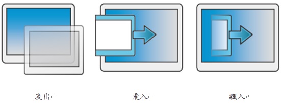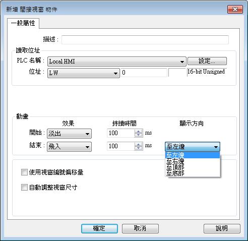 從EasyBuilder Pro V5.07.01開始,功能鍵、間接視窗、直接視窗三個物件提供了淡出、飛入、飄入三種彈出模式。