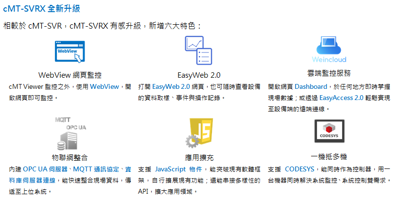 cMT-SVRX 兼具更強大、齊全的軟、硬體規格,無論在遠端監控、物聯網應用、通訊整合、資料分析各方面皆有極優異的表現,將是您下一個人機介面的絕佳選擇。