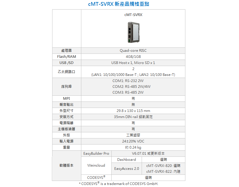 此外,cMT-SVRX 主打輕薄機身、高效能及大容量。在手掌般大小的機身中,cMT-SVRX搭載高規格四核心 CPU 和高容量 4GB Flash 記憶體,並兼具完整的連接埠: 如支援雙乙太網路口、標準序列埠 RS232、RS485 2W/4W,以及外接 USB碟/Micro SD 卡等擴充能力。而在防護配置上,內建主機板塗層以及電源隔離,讓 cMT-SVRX 即使處於工業嚴峻的環境,運作也不受影響。