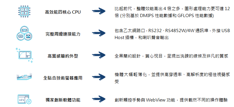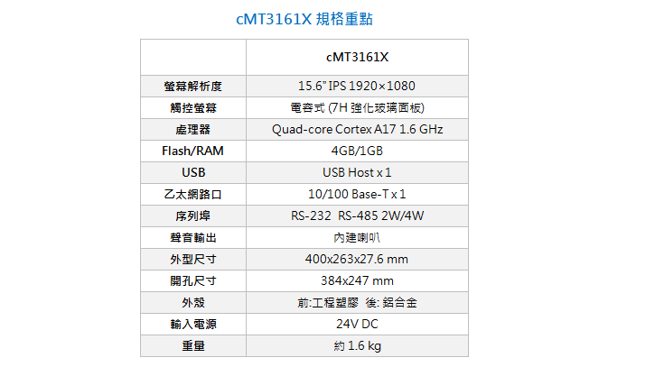 cMT3161X一樣配備當前市面上人機產品中最高階的處理器,能勝任最嚴峻的效能考驗;強大的運算處理能力,可滿足用戶對高速、流暢操作體驗的渴望。憑著其豐富的軟硬體功能與速度優勢,cMT3161X能輕鬆導入各式各樣的應用環境,扮演系統整合中的關鍵角色。