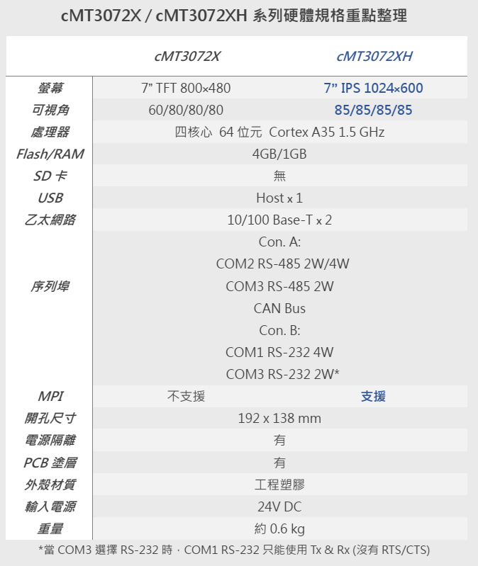 cMT3072XH相較與cMT3072X,使用了高品質IPS螢幕,提供更高的解析度與更佳的顯示品質。除此之外,cMT3072XH也增加MPI通訊介面的支援,可進一步擴大其應用範圍。
