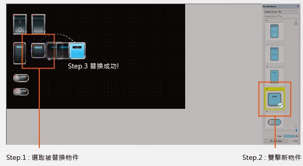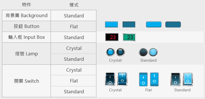 1. 為減少畫面設計所需花費的時間,物件在新建立時,即預設使用新的系統圖庫。系統圖庫提供8種不同組合的圖庫,其中包含5項物件及3種樣式,如下表所示。