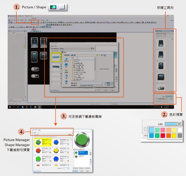 2. 用戶在調配系統圖庫的物件顏色時,可立即看到顏色的變化,大幅提升用戶設計物件的效率。