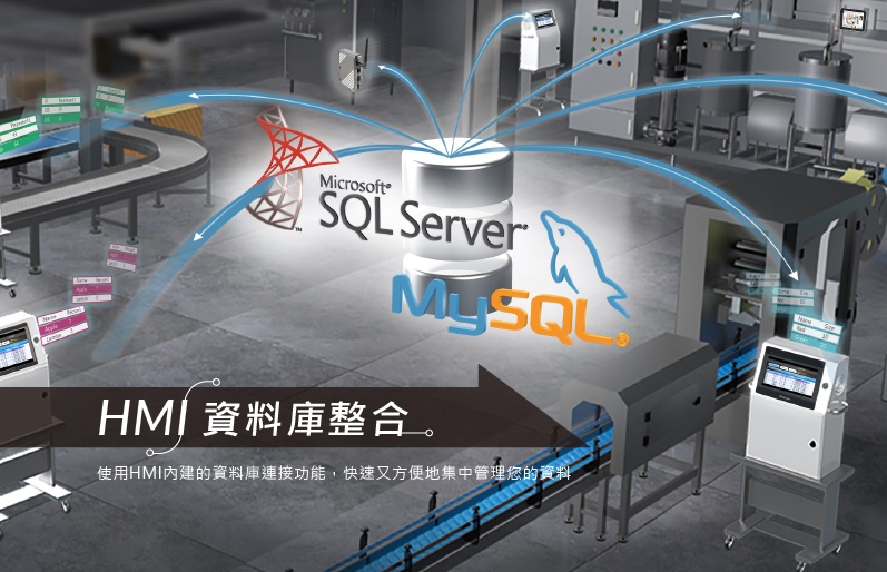 cMT系列人機介面具備使用方便的資料庫整合功能,可快速將設備資訊、生產數據或配方等資料,上傳至資料庫系統中集中管理,大幅簡化數據整合工作。搭配內建的檢視工具,可方便地讀寫資料庫所儲存的資料,輕鬆整合設備相關的所有數據。