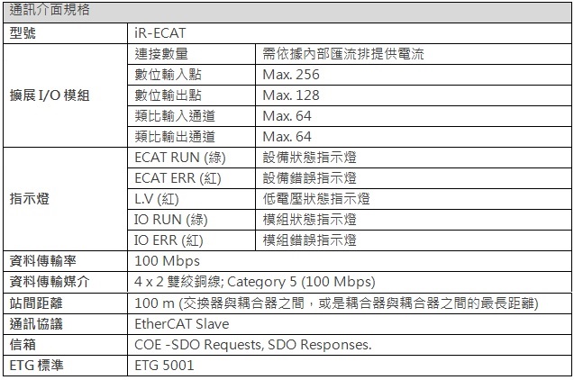 EtherCAT(Ethernet for Control Automation Technology)是一種以乙太網為基礎的現場總線系統;因為其高性能、極具效率且適用於工廠網路之各式裝置的特點,是當前最廣為採用的工業乙太網路通訊標準之一,並已逐漸普及於工業環境的網路通訊應用。有鑒於用戶對於EtherCAT的需求,威綸科技推出EtherCAT通訊耦合器,iR-ECAT,讓iR系列I/O模組也能輕易整合至EtherCAT的網路應用裡。