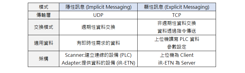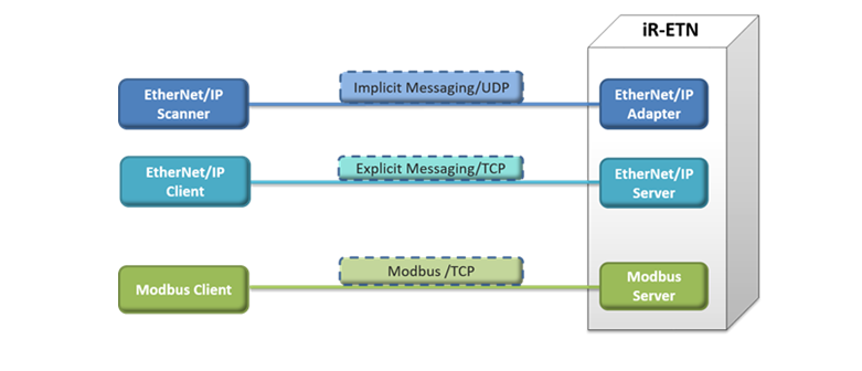 iR-ETN除了能支援EtherNet/IP兩種通訊模式,也可同時使用原有的Modbus-TCP協議。如下圖所示: