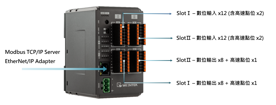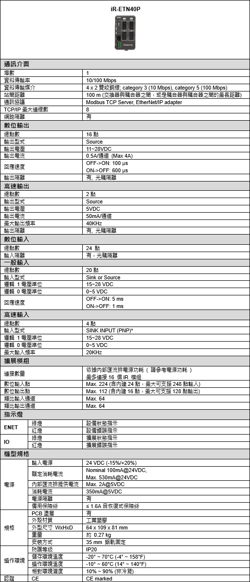 iR-ETN40P 內建MODBUS TCP/IP Server與EtherNet/IP Adapter協議,提供24點數位輸入和16+2點數位輸出。除了內建的I/O外,可擴充式設計允許 iR-ETN40P 依需求增加數位、類比I/O、溫度輸入及運動控制模組,提高系統規劃的彈性與靈活性。另外,輸出、輸入點位皆使用可插拔式歐規端子台,讓配線簡單又有效率。