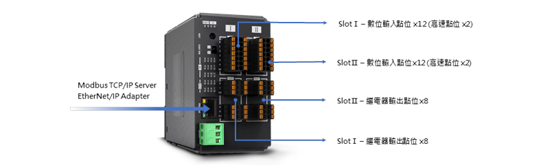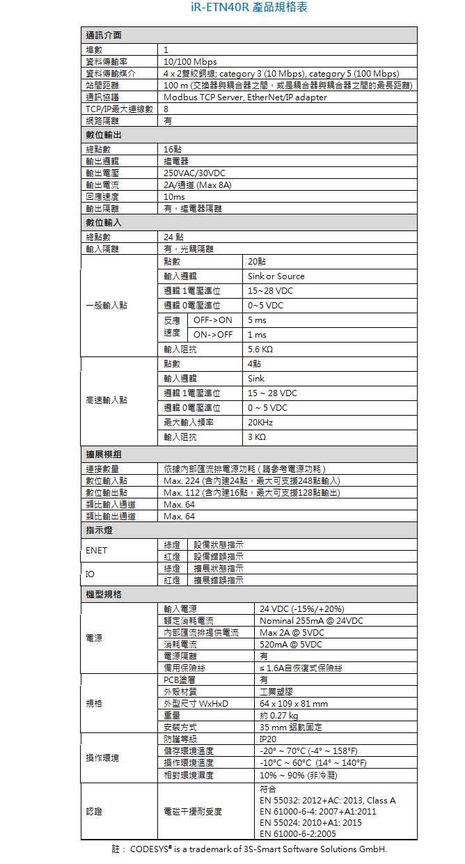 iR-ETN40R內建MODBUS TCP/IP Server與EtherNet/IP Adapter協議,提供24點數位輸入和16點繼電器輸出。除了內建的I/O外,可擴充式設計允許iR-ETN40R依需求增加數位、類比I/O、溫度輸入及運動控制模組,提高系統規劃的彈性與靈活性。另外,輸出、輸入點位皆使用可插拔式歐規端子台,讓配線簡單又有效率。