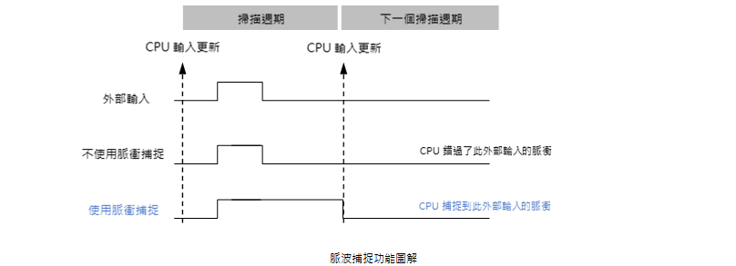 在一次掃描的期間內發生的高速脈衝訊號,可以保持到下一次控制器的掃描,確保不會漏接訊號。