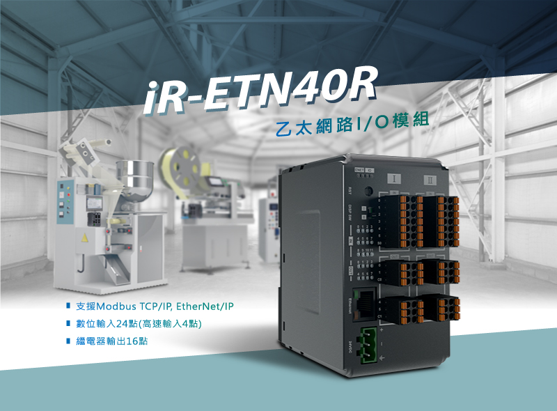 iR-ETN40R是一款可擴充式乙太網路遠端I/O模組,支援Modbus TCP/IP與EtherNet/IP工業網路協議,內建24點數位輸入(包含4點高速輸入)和16點繼電器輸出通道。其I/O配置描述文件可以利用EasyRemoteIO軟體直接產生,能協助您以高效率、低成本的方式,輕鬆建置現代化的自動控制系統。
