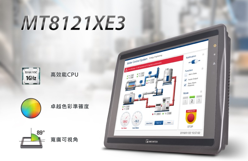 MT8121XE3為12.1”的人機介面,採用強化工業塑膠機殼,搭載高效能1GHz處理器以及1024×768解析度IPS觸控螢幕,並配有完備豐富的外接界面,包含: 序列埠、乙太網路、USB Client、USB Host、SD卡。軟體方面,除了廣泛支援市面上眾多工業設備通訊協議支援外,更支援各式影像功能如 IP攝影機、USB攝影機、VNC Viewer……等。搭配IPS螢幕的絕佳優勢,影像的色彩視覺呈現將更為精緻,為人機使用者提供更為優異的視覺體驗。IPS螢幕的顯示幾乎無死角,可視角可高達89度(全方向),也將為人機安裝方式提供更多可能性。