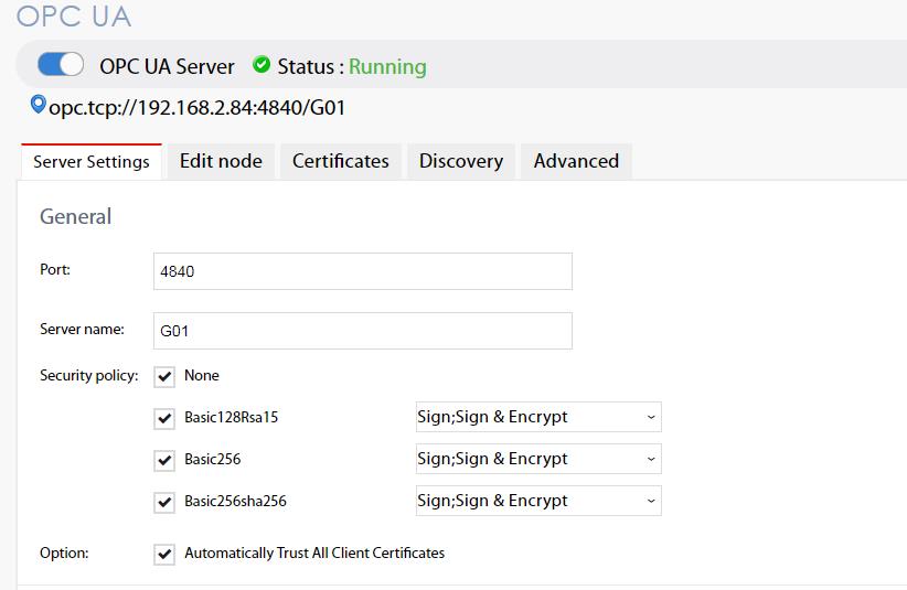 有了這個新功能後,使用者若要修改OPC UA client可以獲得的節點資料,不用再透過重新下載EasyBuilder Pro的專案,而是直接透過瀏覽器,打開cMT Gateway的設定網頁,即可修改節點。同時也能夠設定連線安全等級,以及設定OPC UA client唯獨、唯寫、讀寫皆可的權限。