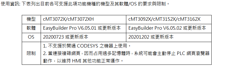 「PLC網頁瀏覽器」屬於HMI中一個完整的功能元件,可以和HMI其他畫面元件同時顯示,同時執行;利用EasyBuilder Pro,也可以將HMI規劃為Kiosk模式 (全螢幕展示),使用靈活性高。