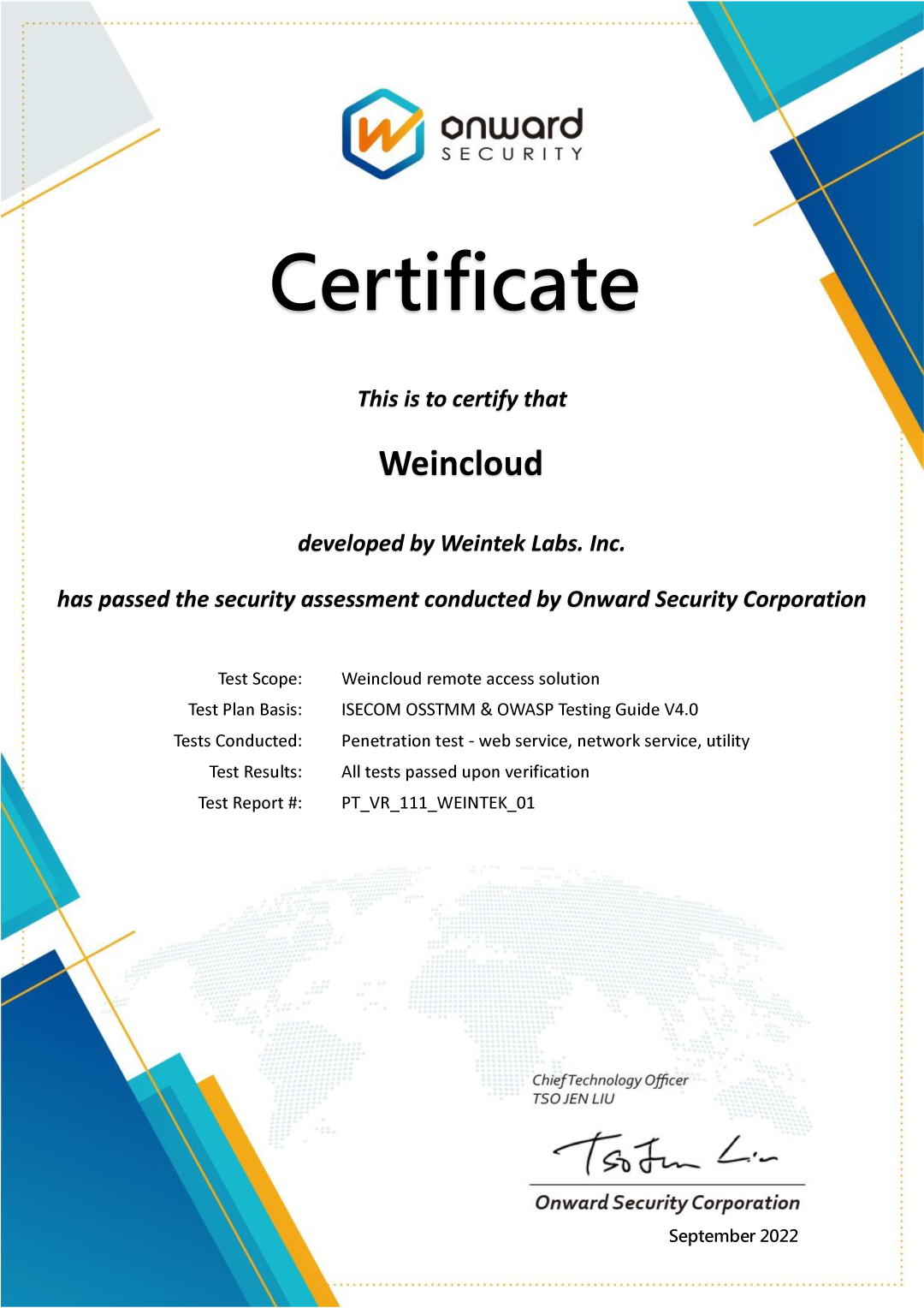 Weincloud 為雲端服務,資訊安全成為首要面對的課題。威綸科技繼2018年取得 EasyAccess2.0 安全認證,在此很開心宣布,Weincloud 雲端服務現已通過第三方實驗室安華聯網 (Onward Security) 資安認證。