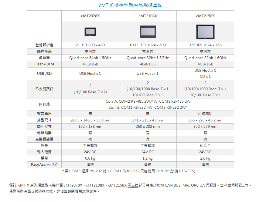 威綸科技將開始銷售三款cMT X系列標準型人機介面: cMT2078X、cMT2108X、cMT2158X。